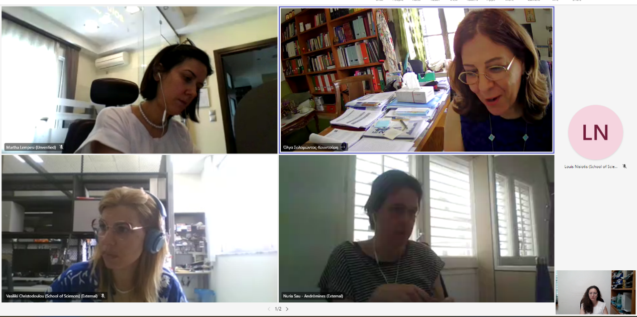 Η διαδικτυακή συνάντηση ξεκίνησε με καλωσόρισμα από την Δρ Όλγα Σολομώντος-Κουντούρη. Ακολούθως συζητήθηκε η τελική συνάντηση που θα γίνει στην Ισπανία και αποφασίστηκε να γίνει 4-5 Νοεμβρίου στην Μπαρτσελόνα και η εταιρεία Associacio Social Andromines θα στείλει Info pack το συντομότερο δυνατόν. Συνεχίζοντας η κ. Συμεωνίδου υπενθύμισε στους εταίρους τις υποχρεώσεις τους σχετικά την εξαμηνιαία έκθεση του προγράμματος (Timesheets, Financial Report, Activity Progress Report, Dissemination Report).