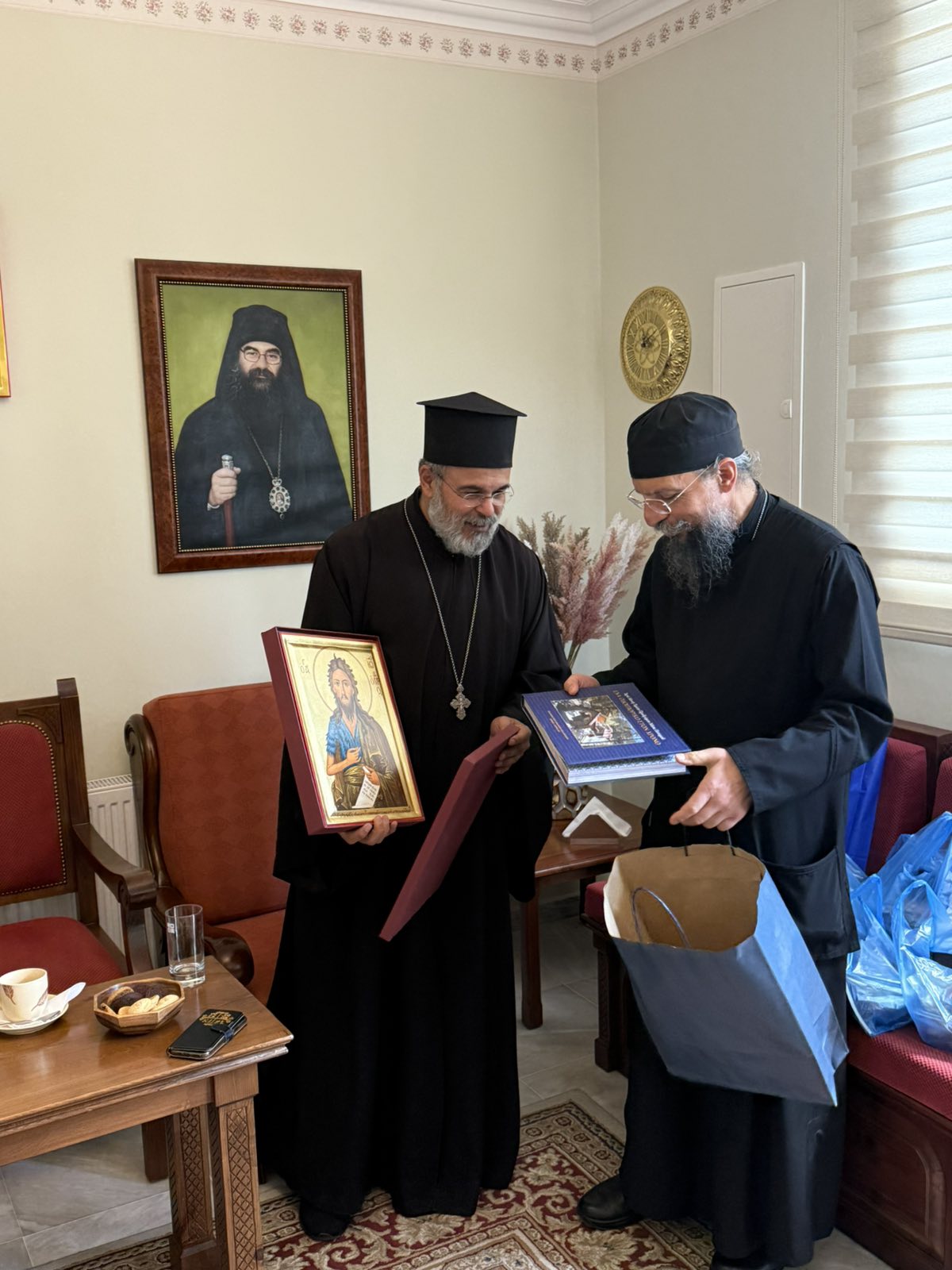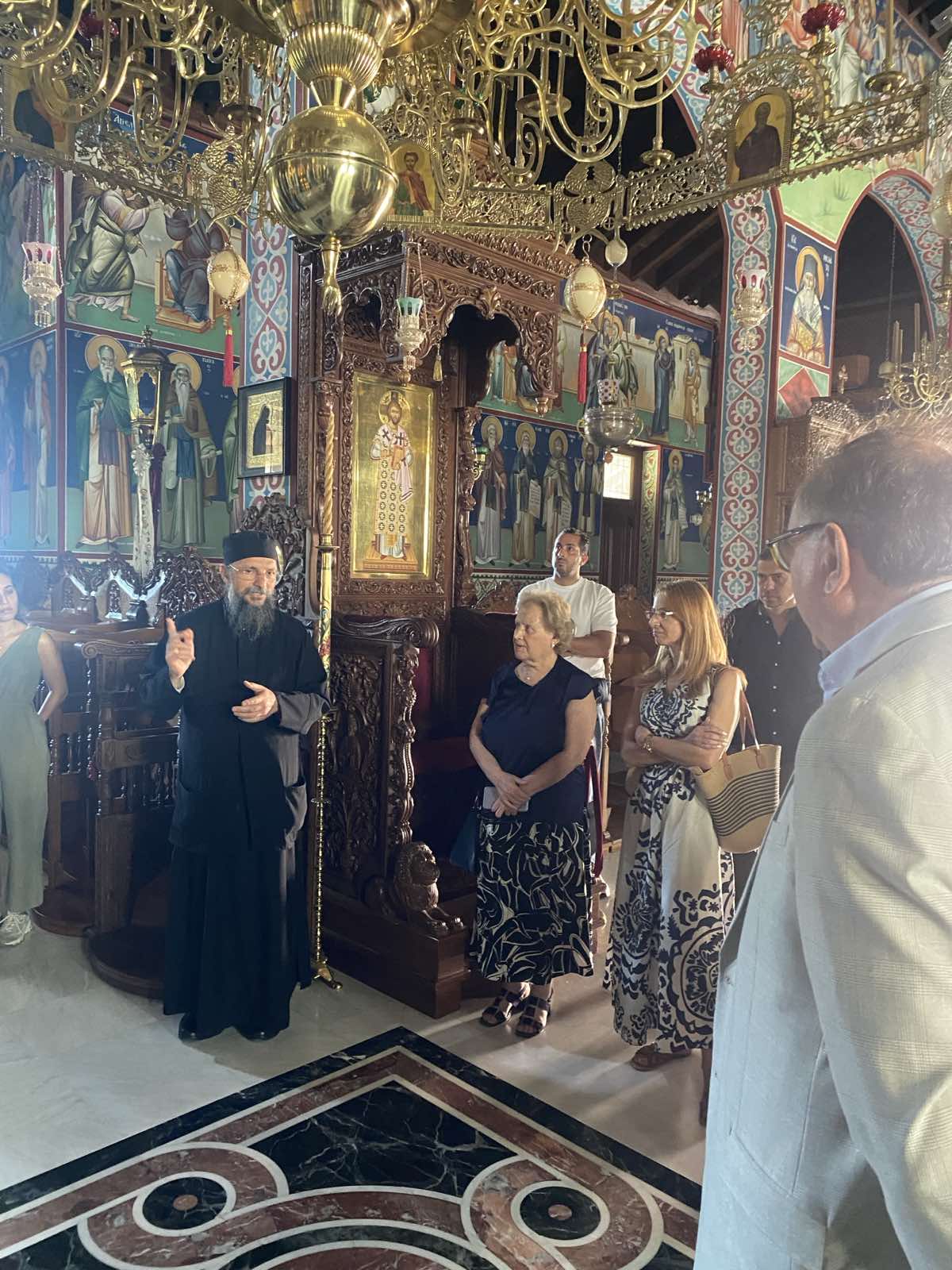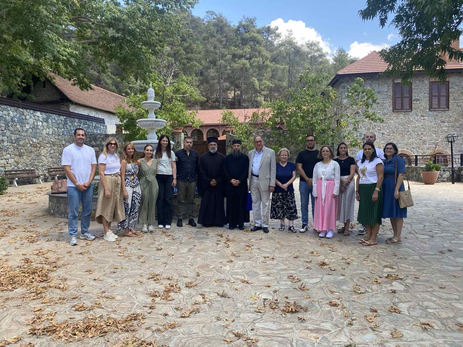 Tη Δευτέρα 8 Σεπτεμβρίου 2025 η Διεύθυνση της Θεολογικής Σχολής της Εκκλησίας της Κύπρου διοργάνωσε για τα μέλη ΔΕΠ και το Διοικητικό προσωπικό της Σχολής μονοήμερη εκδρομή στην Ιερά Μονή Τιμίου Προδρόμου Μέσα Ποταμού. Στην εκδρομή συμμετείχε και ο κ. Κώστας Κωνσταντινίδης (Oμότιμος Καθηγητής Βυζαντινής Ιστορίας του Παν. Ιωαννίνων και Ακαδημαϊκός Συνεργάτης της ΘΣΕΚ στο ΜΠΣ “Ορθόδοξη Θεολογία στην Ανατολική Μεσόγειο”) μαζί με τη σύζυγό του κ. Σωτηρούλα Κωνσταντινίδου. Στην Ιερά Μονή τα μέλη της ΘΣΕΚ επισκέφτηκαν, μεταξύ άλλων, το νέο και παλιό καθολικό της Μονής, και ενημερώθηκαν για την πολυτάραχη ιστορία του μοναστηριού από τον Ηγούμενο, π. Παΐσιο. Ακολούθησε κέρασμα και φιλοξενία στο Αρχονταρίκι, ενώ σε όλα τα μέλη του προσωπικού της Σχολής προσφέρθηκαν επιπρόσθετα χειροποίητα προϊόντα της Μονής καθώς και ένα βιβλιαράκι για τον Όσιο Γέροντα Ιωσήφ τον Ησυχαστή. Ως ελάχιστο αντίδωρο για τη ζεστή και εγκάρδια φιλοξενία, επιδόθηκε από τον Διευθυντή της Σχολής, Πρωτοπρεσβύτερο Kυπριανό Κουντούρη, στον Ηγούμενο της Μονής η εφέστιος εικόνα της Θεολογικής Σχολής, η οποία απεικονίζει την Αγία Τριάδα.