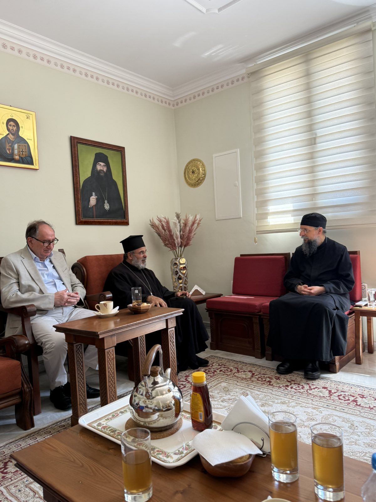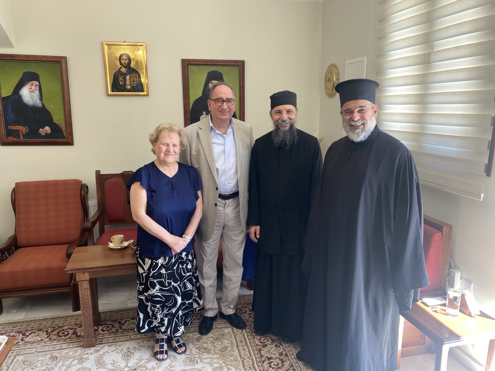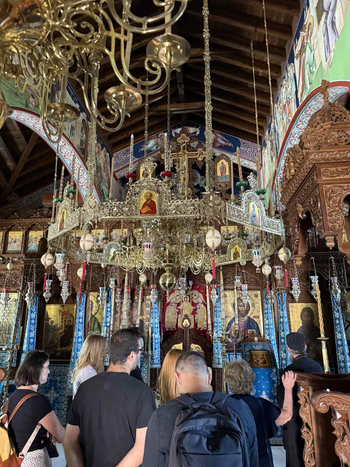 Tη Δευτέρα 8 Σεπτεμβρίου 2025 η Διεύθυνση της Θεολογικής Σχολής της Εκκλησίας της Κύπρου διοργάνωσε για τα μέλη ΔΕΠ και το Διοικητικό προσωπικό της Σχολής μονοήμερη εκδρομή στην Ιερά Μονή Τιμίου Προδρόμου Μέσα Ποταμού. Στην εκδρομή συμμετείχε και ο κ. Κώστας Κωνσταντινίδης (Oμότιμος Καθηγητής Βυζαντινής Ιστορίας του Παν. Ιωαννίνων και Ακαδημαϊκός Συνεργάτης της ΘΣΕΚ στο ΜΠΣ “Ορθόδοξη Θεολογία στην Ανατολική Μεσόγειο”) μαζί με τη σύζυγό του κ. Σωτηρούλα Κωνσταντινίδου. Στην Ιερά Μονή τα μέλη της ΘΣΕΚ επισκέφτηκαν, μεταξύ άλλων, το νέο και παλιό καθολικό της Μονής, και ενημερώθηκαν για την πολυτάραχη ιστορία του μοναστηριού από τον Ηγούμενο, π. Παΐσιο. Ακολούθησε κέρασμα και φιλοξενία στο Αρχονταρίκι, ενώ σε όλα τα μέλη του προσωπικού της Σχολής προσφέρθηκαν επιπρόσθετα χειροποίητα προϊόντα της Μονής καθώς και ένα βιβλιαράκι για τον Όσιο Γέροντα Ιωσήφ τον Ησυχαστή. Ως ελάχιστο αντίδωρο για τη ζεστή και εγκάρδια φιλοξενία, επιδόθηκε από τον Διευθυντή της Σχολής, Πρωτοπρεσβύτερο Kυπριανό Κουντούρη, στον Ηγούμενο της Μονής η εφέστιος εικόνα της Θεολογικής Σχολής, η οποία απεικονίζει την Αγία Τριάδα.
