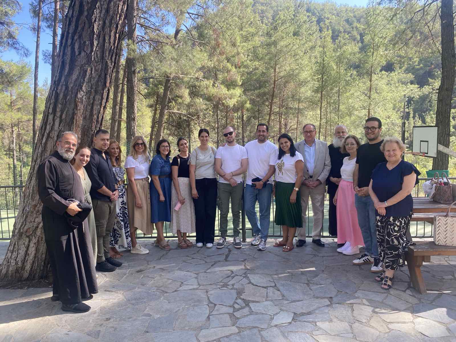 Tη Δευτέρα 8 Σεπτεμβρίου 2025 η Διεύθυνση της Θεολογικής Σχολής της Εκκλησίας της Κύπρου διοργάνωσε για τα μέλη ΔΕΠ και το Διοικητικό προσωπικό της Σχολής μονοήμερη εκδρομή στην Ιερά Μονή Τιμίου Προδρόμου Μέσα Ποταμού. Στην εκδρομή συμμετείχε και ο κ. Κώστας Κωνσταντινίδης (Oμότιμος Καθηγητής Βυζαντινής Ιστορίας του Παν. Ιωαννίνων και Ακαδημαϊκός Συνεργάτης της ΘΣΕΚ στο ΜΠΣ “Ορθόδοξη Θεολογία στην Ανατολική Μεσόγειο”) μαζί με τη σύζυγό του κ. Σωτηρούλα Κωνσταντινίδου. Στην Ιερά Μονή τα μέλη της ΘΣΕΚ επισκέφτηκαν, μεταξύ άλλων, το νέο και παλιό καθολικό της Μονής, και ενημερώθηκαν για την πολυτάραχη ιστορία του μοναστηριού από τον Ηγούμενο, π. Παΐσιο. Ακολούθησε κέρασμα και φιλοξενία στο Αρχονταρίκι, ενώ σε όλα τα μέλη του προσωπικού της Σχολής προσφέρθηκαν επιπρόσθετα χειροποίητα προϊόντα της Μονής καθώς και ένα βιβλιαράκι για τον Όσιο Γέροντα Ιωσήφ τον Ησυχαστή. Ως ελάχιστο αντίδωρο για τη ζεστή και εγκάρδια φιλοξενία, επιδόθηκε από τον Διευθυντή της Σχολής, Πρωτοπρεσβύτερο Kυπριανό Κουντούρη, στον Ηγούμενο της Μονής η εφέστιος εικόνα της Θεολογικής Σχολής, η οποία απεικονίζει την Αγία Τριάδα.
