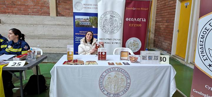 Την Τετάρτη, 25 Φεβρουαρίου 2026, δύο μέλη του Διοικητικού Προσωπικού της ΘΣΕΚ, η κα. Άννα Χριστοδούλου και η κα. Άρτεμις Θεοφανώ Δανδουλάκη, εκπροσώπησαν τη Σχολή στην Εκπαιδευτική Έκθεση που διοργανώθηκε από το Λύκειο Αγίου Νεοφύτου Πάφου. Κατά τη διάρκεια της έκθεσης η κα. Χριστοδούλου και η κα. Δανδουλάκη ενημέρωσαν τους ενδιαφερομένους (μαθητές και καθηγητές) για το Προπτυχιακό Πρόγραμμα Σπουδών Θεολογίας και τα δύο Μεταπτυχιακά Προγράμματα Σπουδών της ΘΣΕΚ, όπως επίσης και για τις πολυάριθμες υποτροφίες και ευκαιρίες που προσφέρει η Σχολή στους φοιτητές της.