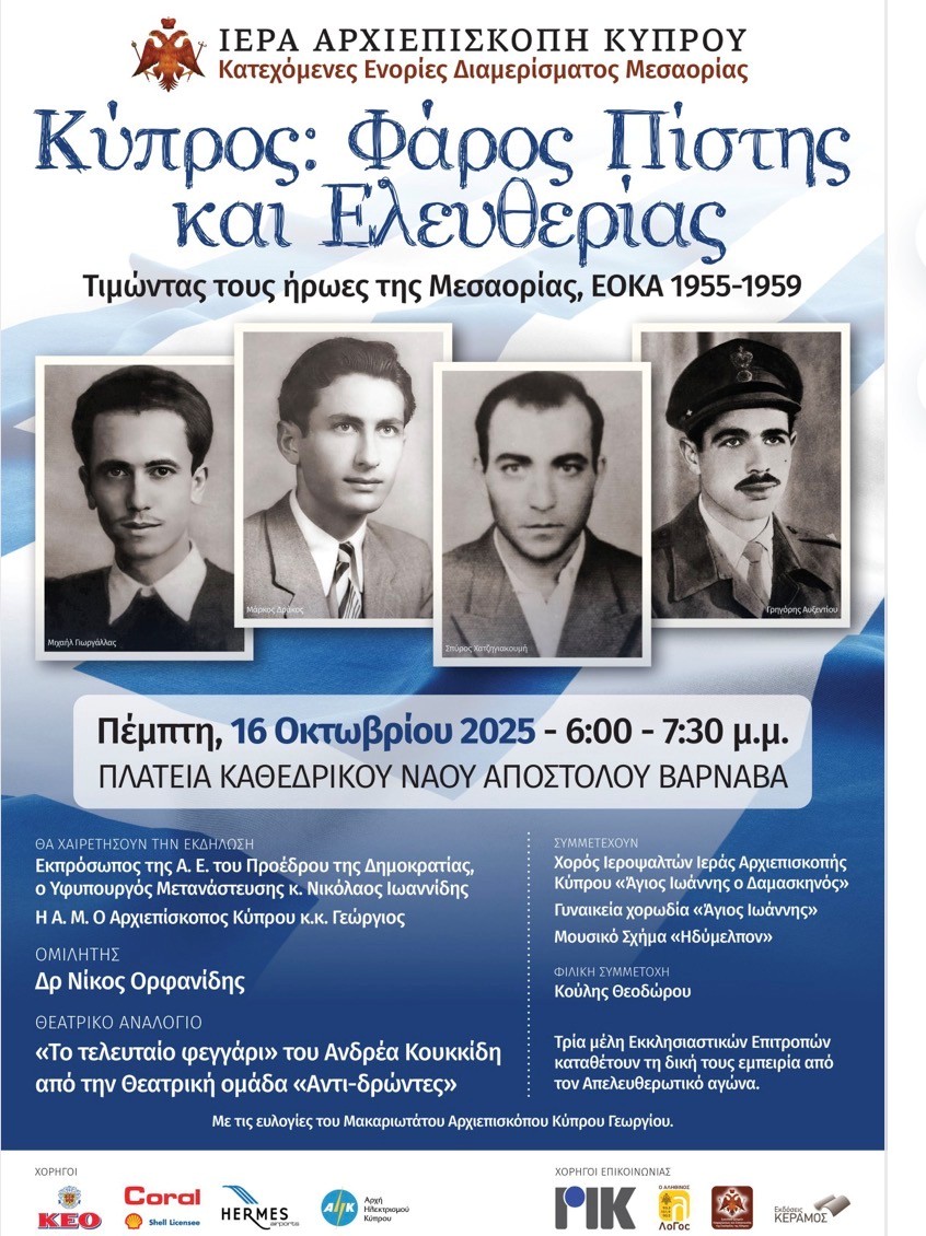 Σας προσκαλούμε στην εκδήλωση της ερχόμενης Πέμπτης 16 Οκτωβρίου 2025 και ώρα 6:00 μ.μ. , στην πλατεία του Καθεδρικού Ναού Αποστόλου Βαρνάβα στην Αρχιεπισκοπή.