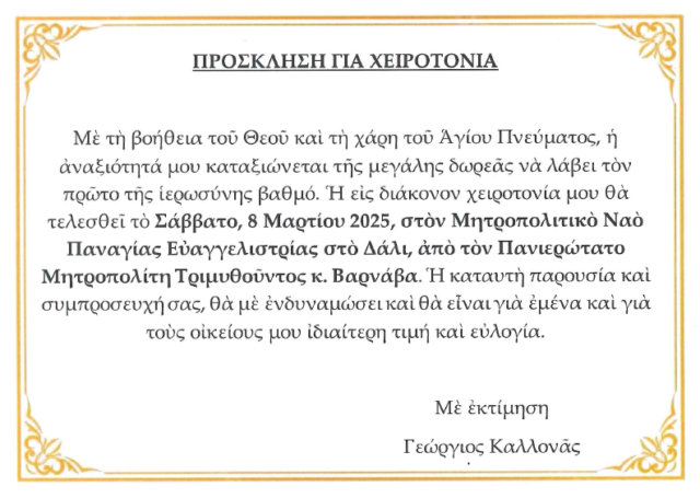 Σας προσκαλούμε στην εκδήλωση της ερχόμενης Πέμπτης 16 Οκτωβρίου 2025 και ώρα 6:00 μ.μ. , στην πλατεία του Καθεδρικού Ναού Αποστόλου Βαρνάβα στην Αρχιεπισκοπή. Η είσοδος είναι ελεύθερη. Περισσότερες πληροφορίες στην ιστοσελίδα: https://churchofcyprus.org.cy/100519