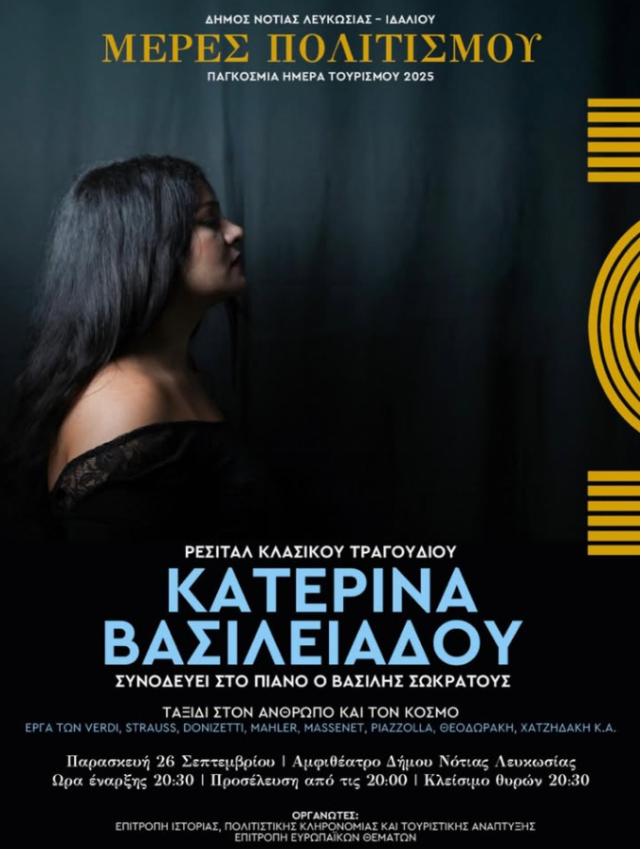 Η Θεολογική Σχολή Εκκλησίας Κύπρου υποστηρίζει το ρεσιτάλ κλασικού τραγουδιού της Κατερίνας Βασιλειάδου, με τη συνοδεία στο πιάνο του Βασίλη Σωκράτους, στο πλαίσιο των εκδηλώσεων «Μέρες Πολιτισμού» για την Παγκόσμια Ημέρα Τουρισμού 2025, προάγοντας πολιτισμό, τέχνη και πνευματική δημιουργία.