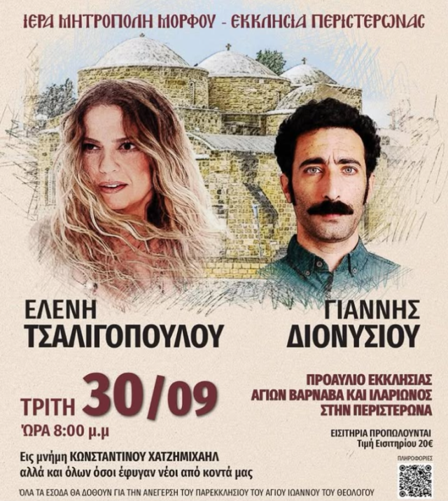 Την Τρίτη 30/09 στις 8:00 μ.μ. στο προαύλιο της εκκλησίας Αγίων Βαρνάβα και Ιλαρίωνος στην Περιστερώνα, η Ελένη Τσαλιγοπούλου και ο Γιάννης Διονυσίου ενώνουν τις φωνές τους σε μια ξεχωριστή μουσική εκδήλωση. Η Θεολογική Σχολή Εκκλησίας Κύπρου στηρίζει την προσπάθεια, με τα έσοδα να προσφέρονται...
