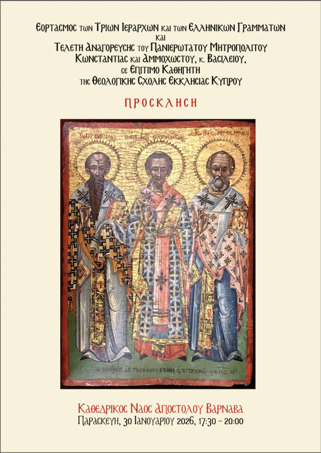 Η Θεολογική Σχολή Εκκλησίας Κύπρου, με την ευκαιρία της Εορτής των Τριών Ιεραρχών και της Ημέρας των Ελληνικών Γραμμάτων, σας προσκαλεί σε διπλή Τελετή, που θα πραγματοποιηθεί την Παρασκευή 30 Ιανουαρίου 2026, στις 17:30, στον Καθεδρικό Ναό του Αποστόλου Βαρνάβα. Κύριος ομιλητής της εκδήλωσης θα...
