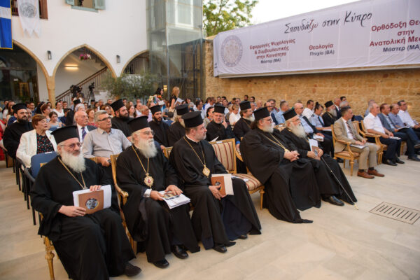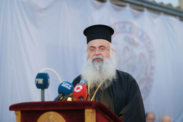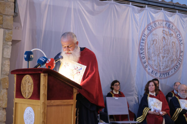 Η κύρια ομιλία της τελετής έγινε από τον Αρχιεπίσκοπο Κύπρου κ.κ. ΓεώργιοΠρόεδρο του Συμβουλίου της Θ.Σ.Ε.Κ. Ο Μακαριώτατος εξέφρασε την ευαρέσκεια του για το θεάρεστο έργο που επιτελείται στη Σχολή από τον Διευθυντή και το λοιπό διδακτικό προσωπικό και εξήρε το χριστιανικό ήθος και τον αξιολογικό προσανατολισμό της Θ.Σ.Ε.Κ., η οποία όπως σημείωσε, έρχεται να καλύψει το αναίτιο και αδικαιολόγητο του κλεισίματος της Θεολογικής Σχολής της Χάλκης από τους Τούρκους, αλλά και την εκκοσμίκευση των Θεολογικών Σχολών της Ελλάδας. Στη συνέχεια, ο Μακαριώτατος αναφέρθηκε στις προκλήσεις που αντιμετωπίζει ο σύγχρονος άνθρωπος, με την πλημμύρα των προκλήσεων και πληροφοριών που προκύπτουν από την τεχνολογική πρόοδο και τον καταιγισμό της διαφήμισης, και οι οποίες τείνουν να εξουδετερώσουν την κριτική σκέψη και να ισοπεδώσουν την ανθρώπινη ελευθερία μέσω της υποτίμησης αξιών και ιδανικών. Ο Μακαριώτατοςυποστήριξε ότι δεν πρέπει να τίθενται φραγμοί στην τεχνολογία και την πρόοδο, διερωτώμενος για τον ρόλο που καλούνται να διαδραματίσουν θεολόγοι και ποιμένες έναντι της τεχνολογικής ανάπτυξης και ιδιαίτερα της τεχνητής νοημοσύνης. Η απάντηση στο ερώτημα αυτό είναι η διαμόρφωση νου Χριστού στον άνθρωπο, αφού ο άνθρωπος είναι που τροφοδοτεί τη μηχανή με ιδέες και προτάσεις. Η θωράκιση του σύγχρονου ανθρώπου με αξίες τοποθετεί και ερμηνεύει τα ανθρώπινα προβλήματα υπό το πρίσμα της λειτουργικής και μυστηριακής ζωής της Εκκλησίας. Ο λόγος του Σταυρού, όπως αυτός υπάρχει στην Εκκλησία, κατέληξε ο Μακαριώτατος, είναι βίωμα, αποκάλυψη και όντως ζωή.