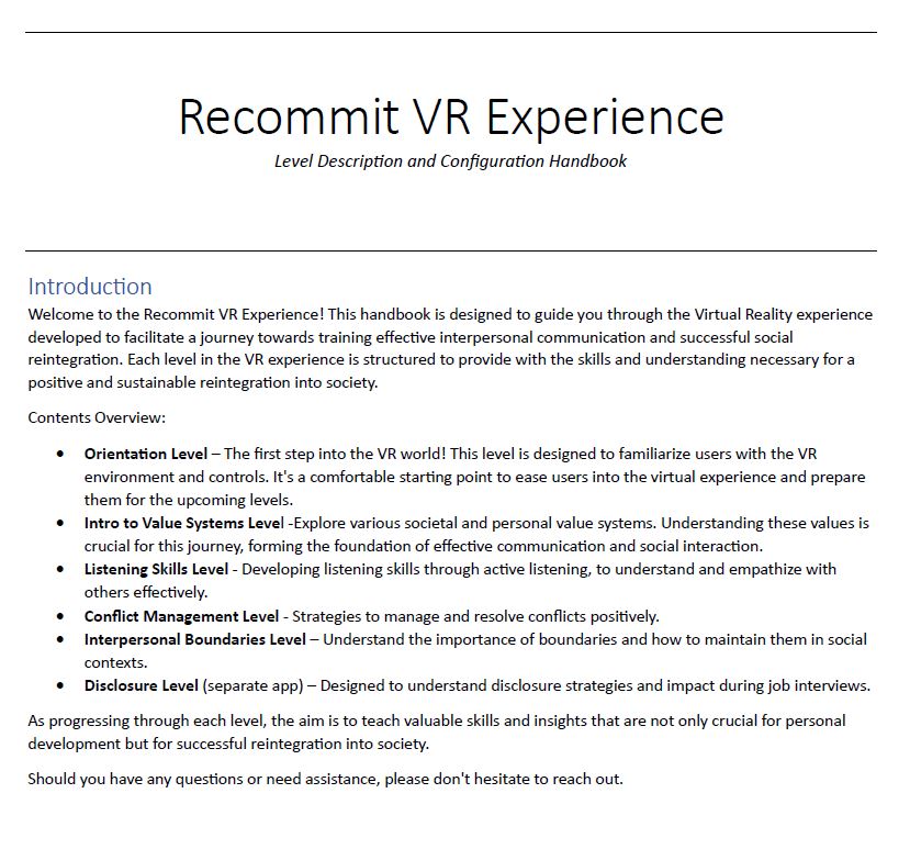 We’re thrilled to announce the completion of the RECOMMIT VR Experience Level Description and Configuration Handbook!